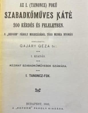 Az I. (tanoncz) fokú Szabadkőműves káté, 200 kérdés és feleletben. A ,,Reform” páholy megbízásából